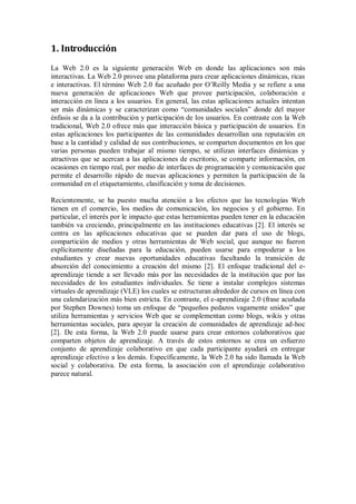 Este documento describe varias herramientas web 2.0 que pueden usarse para el aprendizaje colaborativo, incluyendo MindMeister para crear mapas mentales colaborativos, y MediaWiki, un software wiki gratuito y de código abierto utilizado originalmente por Wikipedia. También analiza 12 herramientas según su capacidad para soportar la comunicación, colaboración, participación de usuarios, código abierto, documentación y interfaz de usuario.