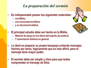 Este documento ofrece instrucciones sobre la preparación y estructura de sermones. Explica que un sermón debe estar basado en la Biblia y tener una introducción, desarrollo y conclusión. También enfatiza la importancia de la preparación personal del predicador y de enfocarse en las necesidades de los oyentes. Finalmente, describe diferentes tipos de sermones y ofrece consejos para preparar un bosquejo efectivo.
