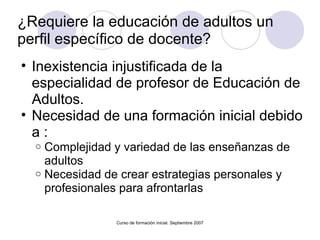 El documento describe el perfil requerido para profesores en la educación de adultos. Señala que estos profesores deben estar capacitados para enseñar a una población heterogénea de diferentes edades y orígenes culturales. También deben usar métodos de enseñanza individualizados y tener paciencia. El documento analiza los diferentes tipos de alumnos y ofertas educativas en los centros de adultos.