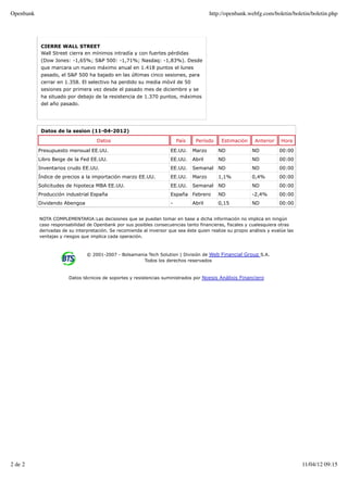 El boletín resume las claves de la sesión bursátil del 11 de abril de 2012, incluyendo eventos en Grecia, Francia y Estados Unidos que podrían afectar los mercados. Wall Street cerró con fuertes pérdidas de entre el 1.6% y el 1.7% en los principales índices. El documento también incluye datos económicos esperados y la agenda de oradores de la Reserva Federal.