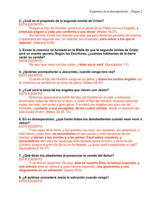 El documento habla sobre la desesperada situación del mundo y la única esperanza que queda, que es la intervención divina a través de la segunda venida de Jesucristo. Explica que la Biblia promete claramente la segunda venida de Cristo para juzgar a los vivos y los muertos, resucitar a los creyentes y darles salvación eterna, mientras que los desobedientes serán condenados.