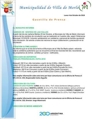 El documento proporciona información sobre varios eventos y cambios en la ciudad de Villa de Merlo. Anuncia cambios en el sentido de circulación de calles, retiro de cartelería publicitaria, finales de torneos deportivos provinciales, cursos ofrecidos en Casa Palmira, tareas de embellecimiento, recolección de residuos y poda, y el festival de guitarras del mundo. También proporciona detalles sobre la novena patronal a Nuestra Señora del Rosario.