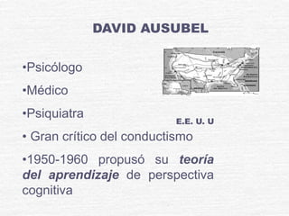 David Ausubel propuso la teoría del aprendizaje significativo, la cual sostiene que el aprendizaje ocurre cuando la nueva información se integra de manera sustancial y no arbitraria a la estructura cognitiva previa del estudiante. Ausubel criticó el conductismo por ignorar la estructura cognitiva del estudiante y promovió el aprendizaje significativo sobre el aprendizaje memorístico. Propuso el uso de organizadores previos y tres condiciones para lograr el aprendizaje significativo.