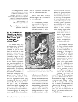 El documento discute la actualidad del Manifiesto Antropófago de Oswald de Andrade a través del trabajo del antropólogo Eduardo Viveiros de Castro. Viveiros de Castro analiza las transformaciones de la sociedad tupi y el canibalismo desde una perspectiva que enfatiza la capacidad de los indígenas de verse a sí mismos desde la perspectiva del otro. El canibalismo tupi no era meramente físico sino una forma de identificarse con el enemigo. La llegada de los europeos reemplazó esta práctica y llev