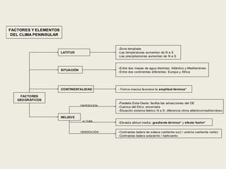 Este documento describe los factores climáticos de España. La latitud, situación geográfica entre dos masas de agua y continentes, y el relieve afectan el clima. Las temperaturas y precipitaciones aumentan de norte a sur. Los centros de acción atmosféricos, masas de aire, y frentes influyen en el clima. Hay varios tipos de tiempo representativos como lluvias generalizadas en invierno, gota fría en otoño, y olas de calor en verano.