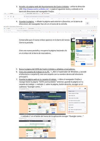 El documento proporciona instrucciones para realizar varias tareas básicas en un navegador web como Firefox, incluyendo abrir páginas web específicas, guardar páginas en favoritos y carpeta, y navegar entre pestañas y marcadores.