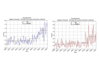 El documento analiza las tendencias de temperatura y precipitación en Paraguay y proyecta escenarios futuros para el departamento de Misiones. Se observa un aumento constante de la temperatura en todas las localidades estudiadas, con los primeros años del siglo XXI siendo los más cálidos registrados. También se detecta un aumento en la precipitación total anual en la mayoría de las ciudades, aunque la tendencia no es tan clara.