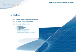 El documento discute la implementación de los modelos CMMI e ISO 15504 en la compañía Panel. Panel decidió implementar ambos modelos a la vez para aprovechar sinergias y recursos compartidos. Aunque los modelos no son idénticos, comparten muchas mejores prácticas y es posible armonizarlos. La implementación simultánea les permitió a Panel mejorar sus procesos y posicionarse mejor ante clientes potenciales.