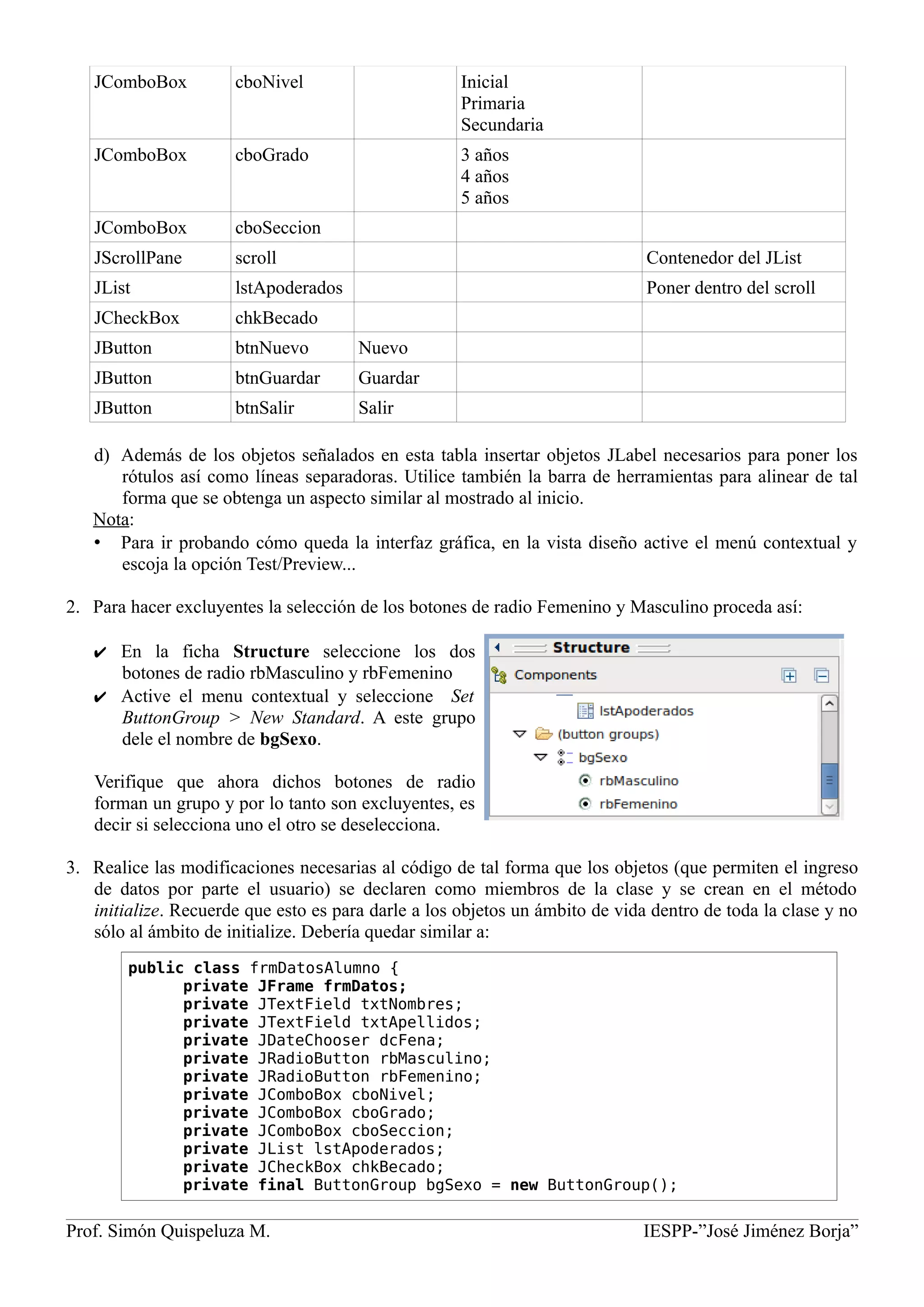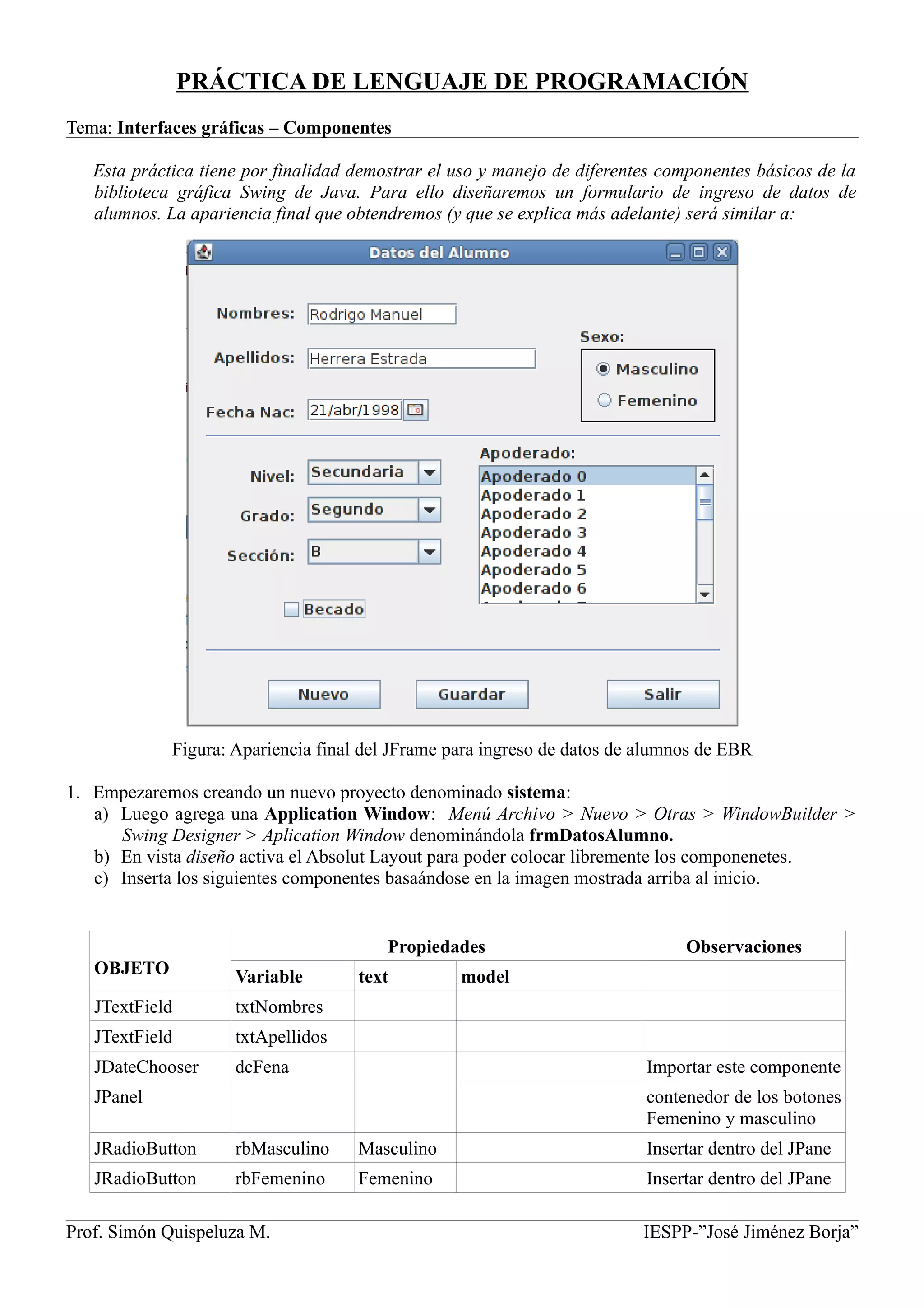 Este resumen describe un programa para ingresar datos de alumnos utilizando componentes gráficos de Swing en Java. Se crea un formulario con campos de texto, botones de radio, cuadros combinados, lista y botones. Se utilizan métodos como setModel() para configurar los cuadros combinados, clearSelection() para limpiar selecciones, y actionPerformed() para programar la interacción. El objetivo es demostrar el uso básico de estos componentes para crear interfaces gráficas.