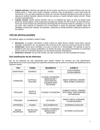 Este documento describe los conceptos básicos del sistema articular, incluyendo las definiciones de articulación, elementos articulares como cartílagos y ligamentos, y las clasificaciones de articulaciones. Existen tres tipos principales de articulaciones - sinartrosis, anfiartrosis y diartrosis - siendo estas últimas las más móviles. Las diartrosis se subdividen según la forma de las superficies óseas en contacto, como enartrosis esféricas, condileas elípticas, trocleares y trocoideas, determinando los movimientos permit
