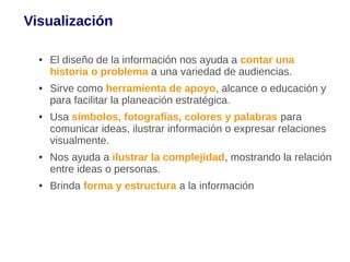 Este documento describe las estrategias de visualización de información para comunicar ideas de manera efectiva. Explica que la visualización de datos nos ayuda a ilustrar la complejidad de problemas y relaciones de manera clara. También provee consejos para diseñar visualizaciones que sean simples, claras y efectivas para la audiencia objetivo.