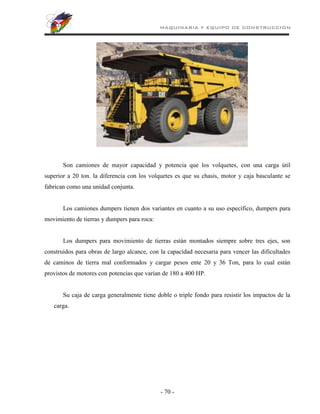 El documento describe diferentes tipos de maquinaria y equipo de transporte utilizados en construcción, incluyendo camiones dumpers, volquetes, y camiones aguateros. Explica las características, usos y factores que afectan la productividad de cada tipo de equipo. Además, analiza el trabajo combinado de volquetes y equipo de carga para optimizar la capacidad.