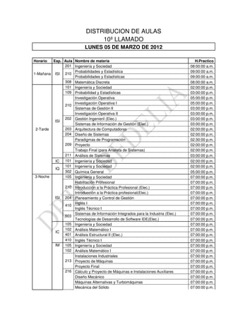 Este documento presenta el horario de distribución de aulas para el 10o llamado del lunes 5 de marzo de 2012. Incluye los horarios y aulas asignadas para las diferentes materias en los turnos mañana, tarde y noche.