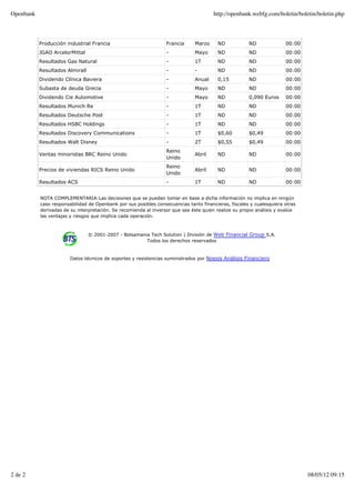 El documento resume las claves del mercado bursátil para el martes 8 de mayo de 2012, incluyendo los índices de cierre en Wall Street, los discursos previstos de varios miembros del BCE, y la subasta de deuda griega programada para ese día. También incluye datos económicos esperados y resultados empresariales.