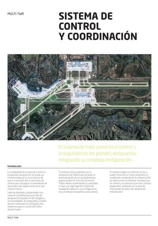 El documento describe un sistema de control de tráfico aéreo diseñado por Indra para aeropuertos con múltiples torres de control. El sistema integra las distintas torres para funcionar de forma automática y coordinada, manteniendo la coherencia de datos. Cuenta con subsistemas para comunicaciones de voz, supervisión, procesamiento de datos de vigilancia y planes de vuelo que permiten el control del tráfico aéreo entre las diferentes torres de manera segura y eficiente.