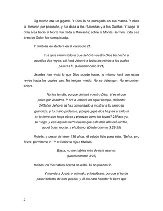 Este documento resume el capítulo 3 y parte del capítulo 4 del libro de Deuteronomio. Narra cómo los israelitas conquistaron 60 ciudades fortificadas en Basán, incluyendo a su rey Og, un gigante, con la ayuda de Dios. Moisés les recuerda no temer a las ciudades fortificadas ni a los gigantes, pues Dios les dará la victoria. También les advierte no agregar ni quitar de la ley que Dios les dio y enseñarla a sus hijos. Finalmente, les prohíbe hacer im