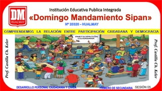 Este documento habla sobre la participación ciudadana. Explica que la participación ciudadana no se limita solo a votar, sino que también incluye expresar opiniones, reunirse con otros, y participar en asuntos públicos que afectan la convivencia democrática. Algunos ejemplos de participación ciudadana son organizarse con compañeros de clase para resolver un problema común, o con la comunidad para enfrentar un problema nacional. La participación puede ser a nivel individual, como dar opiniones en redes sociales, o colectiva, como participar en cabildos abiert