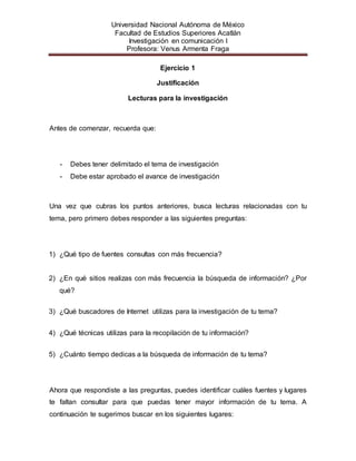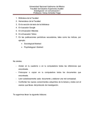 Este documento proporciona instrucciones a los estudiantes sobre cómo realizar una investigación, incluyendo delimitar el tema, obtener la aprobación del avance, consultar fuentes como bibliotecas, buscadores en línea, índices de revistas, tomar notas de referencias, leer documentos y crear redes conceptuales. También sugiere llevar un registro de actividades de investigación realizadas, fuentes consultadas, corrientes teóricas, conceptos, metodología, técnicas y lugar de investigación.