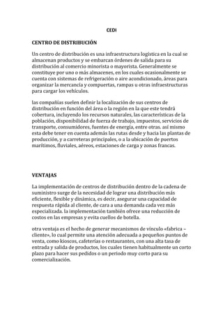 Este documento describe los centros de distribución (CEDI), incluyendo su definición, ventajas, requerimientos, diseño, gestión, procesos de picking y packing, y ejemplos de CEDIs en Colombia. Un CEDI es una infraestructura logística donde se almacenan productos y se preparan pedidos para su distribución a minoristas y mayoristas. Implementar CEDIs mejora la eficiencia y flexibilidad de la cadena de suministro.