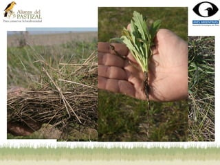 Este documento resume los esfuerzos de restauración de pastizales llevados a cabo por Pablo Grilli y Gustavo Marino en las sabanas entrerrianas de Argentina. Reporta algunos resultados iniciales positivos como mayores tasas de crecimiento de plantas como rye grass entre las plantadas que entre las testigo. También presenta una lista de especies de aves observadas en el sitio. Finalmente agradece la colaboración de varias personas e instituciones en estos esfuerzos de conservación.