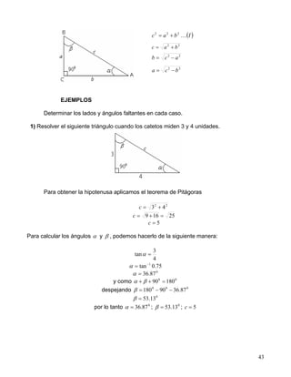 Este documento describe las funciones trigonométricas y su uso para resolver triángulos rectángulos. Explica las razones trigonométricas (seno, coseno, tangente, etc.), cómo usar el teorema de Pitágoras para calcular lados desconocidos, y cómo resolver triángulos rectángulos dadas diferentes medidas. También cubre el uso de las funciones trigonométricas en cualquier cuadrante y provee ejemplos numéricos.