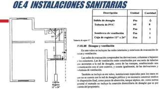 El documento describe los diferentes sistemas e instalaciones sanitarias incluyendo aparatos sanitarios y accesorios, sistema de agua fría, sistema de agua caliente, sistema contra incendio, sistema de drenaje pluvial y sistema de desagüe y ventilación. Se dividen cada sistema en partes como suministro, instalación, redes de distribución, accesorios y válvulas, detallando la unidad de medida para cada parte.