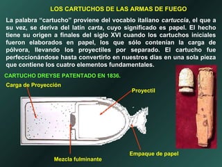 1) El documento explica el origen de la palabra "cartucho" y cómo este se ha desarrollado a lo largo de la historia para convertirse en una sola pieza que contiene los cuatro elementos fundamentales.