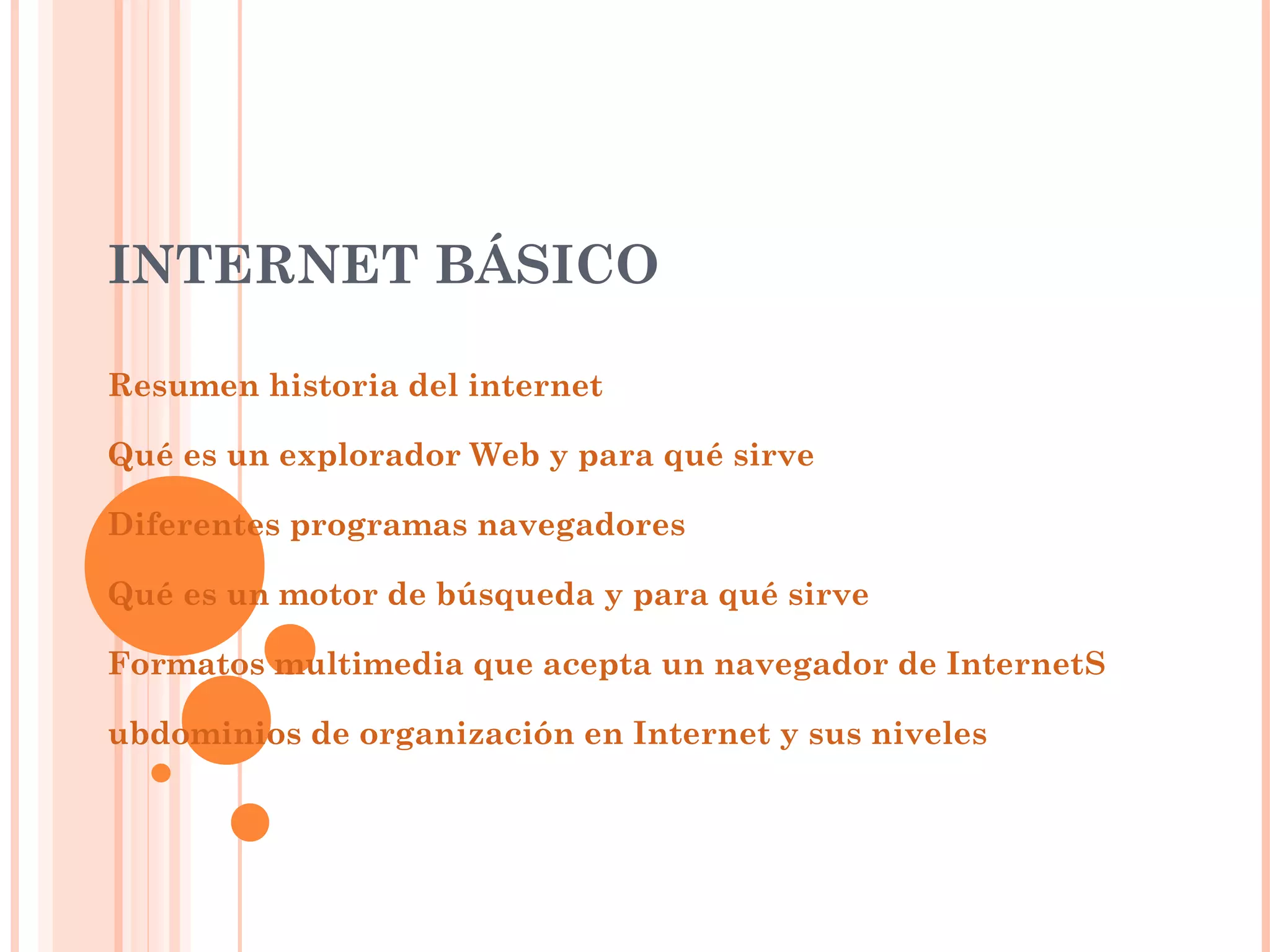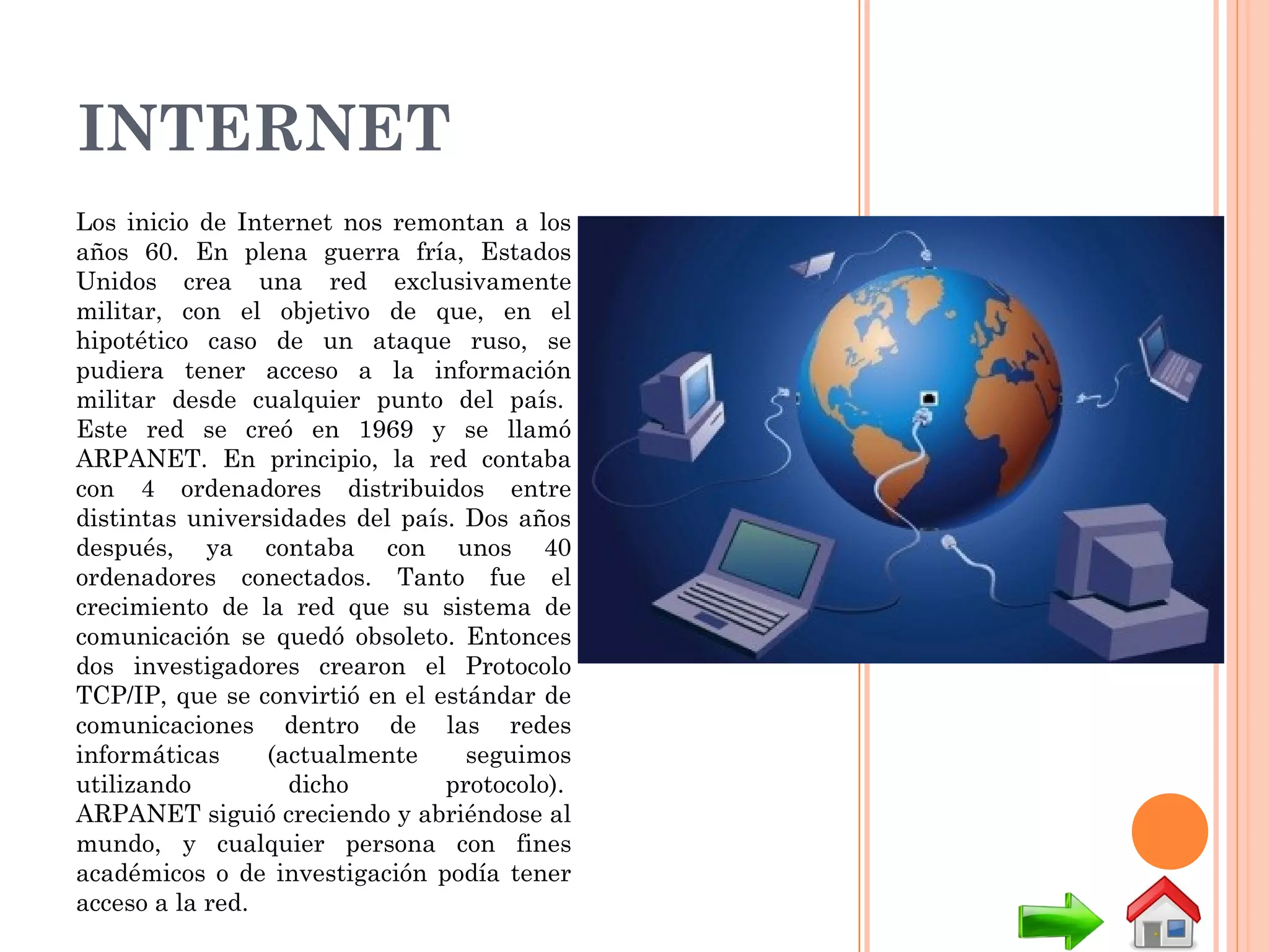 El documento resume la historia de Internet desde su creación como red militar estadounidense llamada ARPANET en los años 60 hasta su evolución en la actualidad. Explica qué son un explorador web, motor de búsqueda y los diferentes formatos multimedia compatibles. También define los subdominios como subdivisiones organizativas de un dominio principal en Internet.