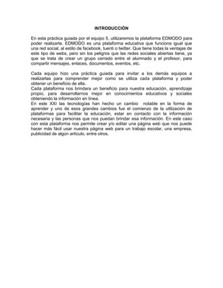 Este documento presenta una práctica guiada sobre el uso de la plataforma educativa Edmodo. Explica que Edmodo funciona como una red social privada para estudiantes y profesores, donde se pueden compartir mensajes, enlaces y documentos. La práctica guiada muestra los pasos para crear una cuenta de estudiante e ingresar a un grupo en Edmodo, así como para crear una cuenta de profesor y administrar un grupo. El objetivo es aprender a utilizar las funciones básicas de la plataforma para fines educativos.
