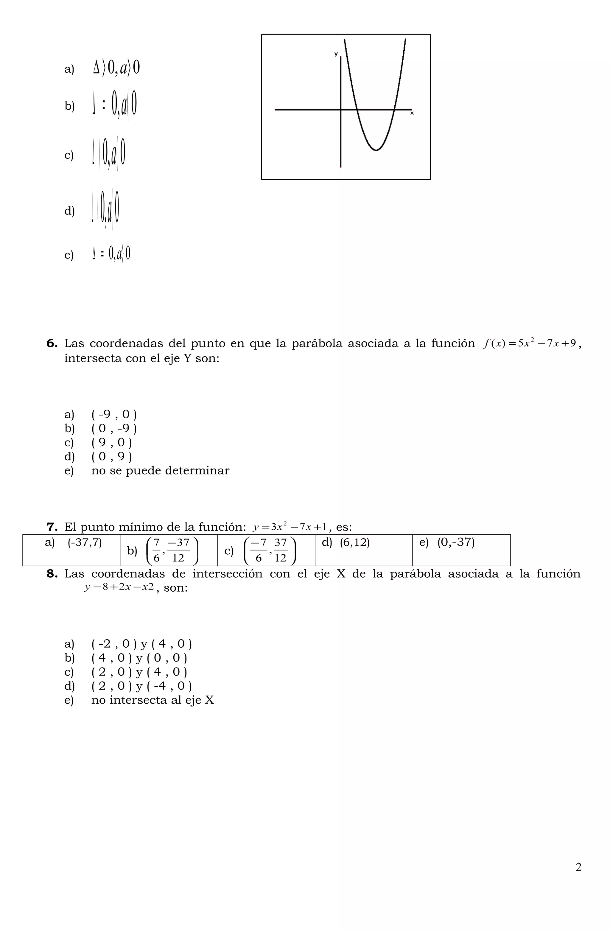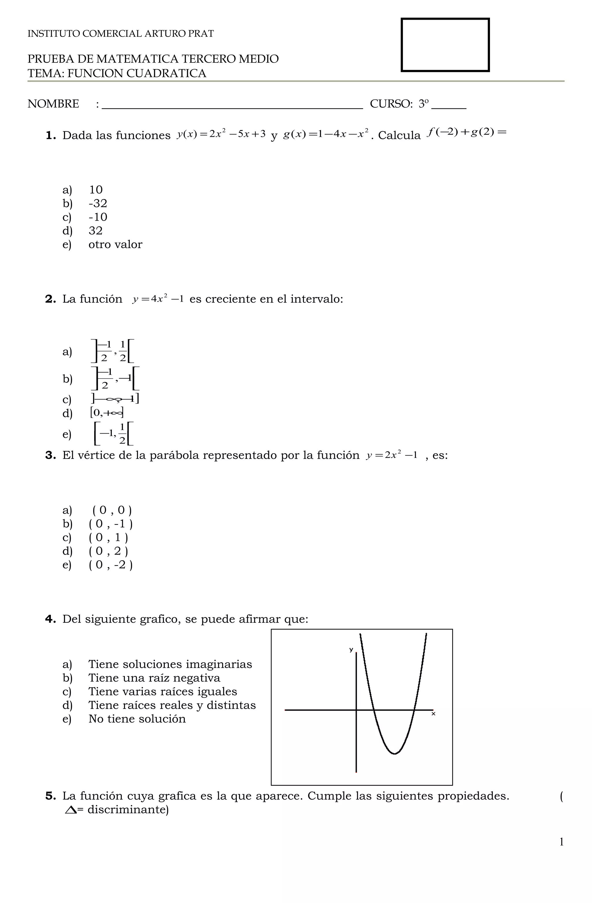 Este documento contiene 12 preguntas sobre funciones cuadráticas. Las preguntas cubren temas como calcular valores de funciones, determinar intervalos de crecimiento, encontrar vértices de parábolas, identificar gráficas de funciones cuadráticas y simplificar funciones a la forma estándar. El objetivo es evaluar la comprensión del estudiante sobre conceptos clave de funciones cuadráticas.