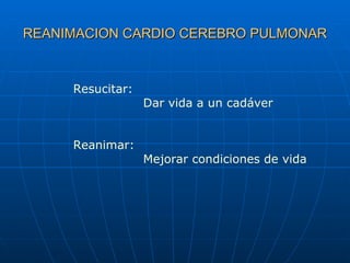 El documento proporciona información sobre reanimación cardiopulmonar y cerebral. Explica los pasos clave de la reanimación primaria y secundaria, incluido mantener la vía aérea abierta, dar apoyo ventilatorio y circulatorio, y realizar diagnósticos diferenciales. Los procedimientos discutidos incluyen compresiones torácicas, desfibrilación, administración de medicamentos y acceso vascular para líquidos. El objetivo general es restablecer la función cardíaca y respiratoria y prevenir daños cerebrales