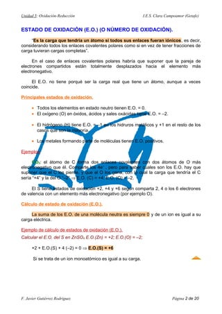 Este documento presenta los conceptos fundamentales de la oxidación-reducción. Explica el estado de oxidación, la oxidación y la reducción, los oxidantes y reductores, y cómo ajustar ecuaciones redox mediante el método del ión-electrón. También cubre valoraciones redox, pilas electroquímicas, potenciales estándar de reducción y aplicaciones industriales de procesos redox.