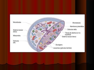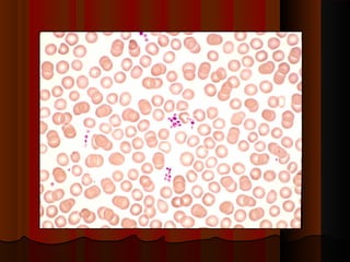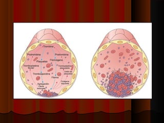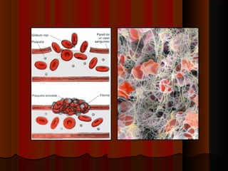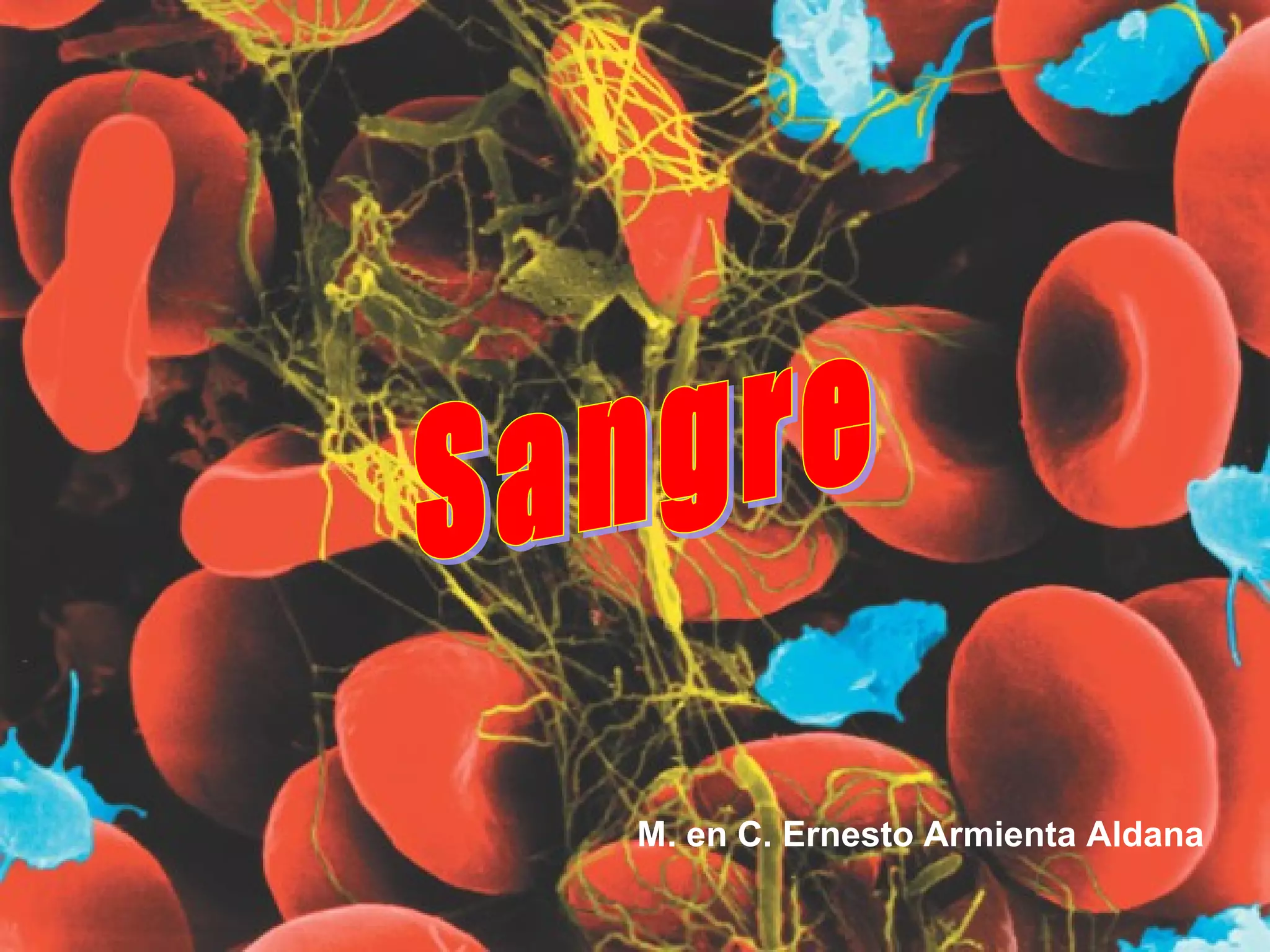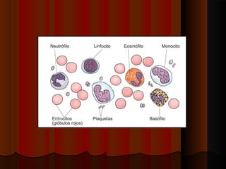 Este documento describe los componentes de la sangre y sus funciones. La sangre está compuesta de plasma, plaquetas, glóbulos rojos, y glóbulos blancos. El plasma transporta nutrientes, desechos, hormonas e inmunoglobulinas. Las plaquetas ayudan a formar coágulos para detener hemorragias. Los glóbulos rojos transportan oxígeno y dióxido de carbonio usando la hemoglobina. Los glóbulos blancos combaten infecciones y producen anticuerpos. La médula ósea produce todas
