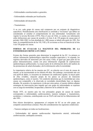 Este documento describe la magnitud del problema de las enfermedades crónicas en Chile. Las enfermedades crónicas afectan predominantemente a los adultos mayores y representan un desafío importante para la salud pública. Las tres principales causas de muerte en Chile son las enfermedades cardiovasculares, los tumores malignos y los traumatismos. Las enfermedades crónicas más comunes incluyen las cardiovasculares, el cáncer, la diabetes y las enfermedades pulmonares y mentales.