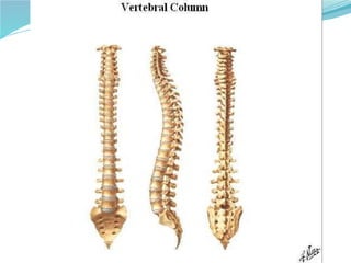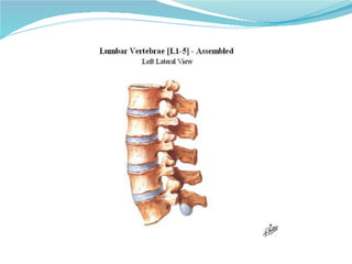 El esqueleto del tronco se divide en la columna vertebral, el tórax y la pelvis. La columna vertebral está formada por 5 segmentos (cervical, torácico, lumbar, sacro y cóccix) y curvaturas fisiológicas, y contiene la médula espinal. El tórax está formado por las vértebras dorsales, las costillas y el esternón. La pelvis está compuesta por los huesos ilíacos, el sacro y el cóccix.