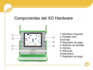 Este documento describe los principales componentes de hardware y software del XO, una laptop educativa. Entre los componentes de hardware se incluyen la pantalla, micrófono, cámara, altavoces y puertos. El software incluye el sistema operativo Linux, el entorno de escritorio Sugar con actividades educativas, y opciones de entretenimiento. También se proporcionan instrucciones para realizar diagnósticos, actualizar la fecha y hora, eliminar aplicaciones y solucionar problemas comunes.