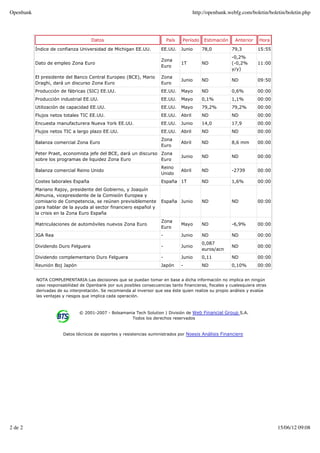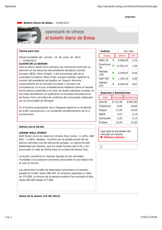 Este boletín diario resume las claves bursátiles para el viernes 15 de junio de 2012, incluyendo los discursos esperados del presidente del BCE Mario Draghi y del economista jefe Peter Praet. También cubre los datos macroeconómicos esperados de EE.UU. y la zona euro, así como la reunión prevista entre el presidente español Mariano Rajoy y el comisario de competencia de la UE Joaquín Almunia sobre la crisis financiera española. Por último, resume el cierre al alza de Wall Street impulsado por posibles