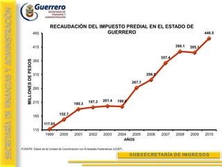 Este documento presenta gráficos que muestran la recaudación de impuestos en el estado de Guerrero, México entre 1999-2010. La recaudación del impuesto predial, el servicio de agua y la zona federal marítimo-terrestre aumentaron durante este período. Un proyecto de modernización catastral costó 132 millones de pesos pero generó mayores participaciones de 401.6 millones de pesos para los municipios a través del Fondo de Fomento Municipal y mayores ingresos directos de 246.9 millones para las arcas municipales por