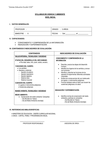 Este documento presenta el syllabus de Ciencia y Ambiente para el nivel inicial de 5 años en 4 bimestres. Cada bimestre incluye contenidos sobre el cuerpo humano, el medio ambiente, seres vivos y no vivos, y el universo. Los estudiantes desarrollarán capacidades de conocimiento y experimentación relacionadas a estos temas.