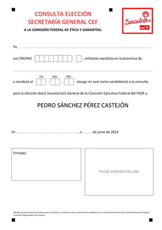 Este documento presenta un modelo para recoger avales de militantes socialistas en apoyo de las candidaturas a la Secretaría General de la Comisión Ejecutiva Federal del PSOE. El modelo incluye espacios para que los militantes que otorgan su aval introduzcan sus datos personales como el nombre, DNI, provincia y fecha de nacimiento, así como el nombre del candidato al que otorgan su apoyo.