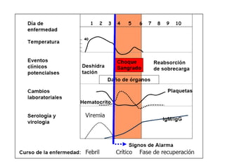El documento resume la información sobre el virus del dengue. En 3 oraciones: El dengue es causado por un flavivirus transmitido por mosquitos que infecta monocitos humanos. Puede causar fiebre, dolor de cabeza y erupción cutánea. En casos graves, el virus puede causar escape de líquido de los vasos sanguíneos y potencialmente choque o fallo de órganos.