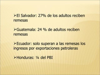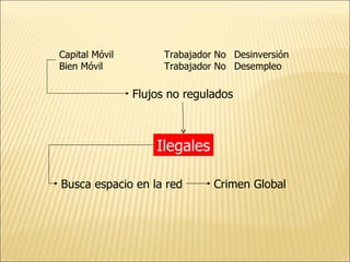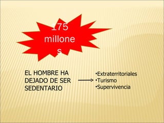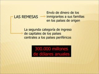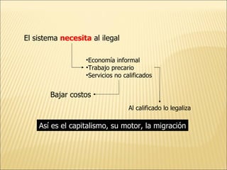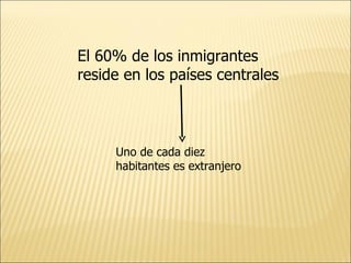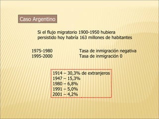 El documento habla sobre los flujos humanos a nivel global y cómo la humanidad ha dejado de ser sedentaria. Menciona que el 10% de la población del mundo desarrollado son inmigrantes y que la migración aumentó un 30% a pesar de las leyes restrictivas en más de la mitad de los países. También destaca que el 60% de los inmigrantes viven en países centrales y que las remesas que envían los migrantes a sus países de origen ascienden a 300.000 millones de dólares anuales.