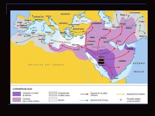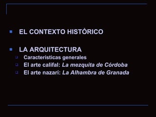 El documento resume el contexto histórico del arte hispano-musulmán y describe sus características arquitectónicas principales. Explica que tras la conquista musulmana de la Península Ibérica en el siglo VIII surgió el emirato y luego el califato de Córdoba, periodos de esplendor cultural. Destaca las mezquitas de Córdoba y el palacio nazarí de la Alhambra como ejemplos principales que ilustran las convenciones arquitectónicas como el uso del ladrillo,