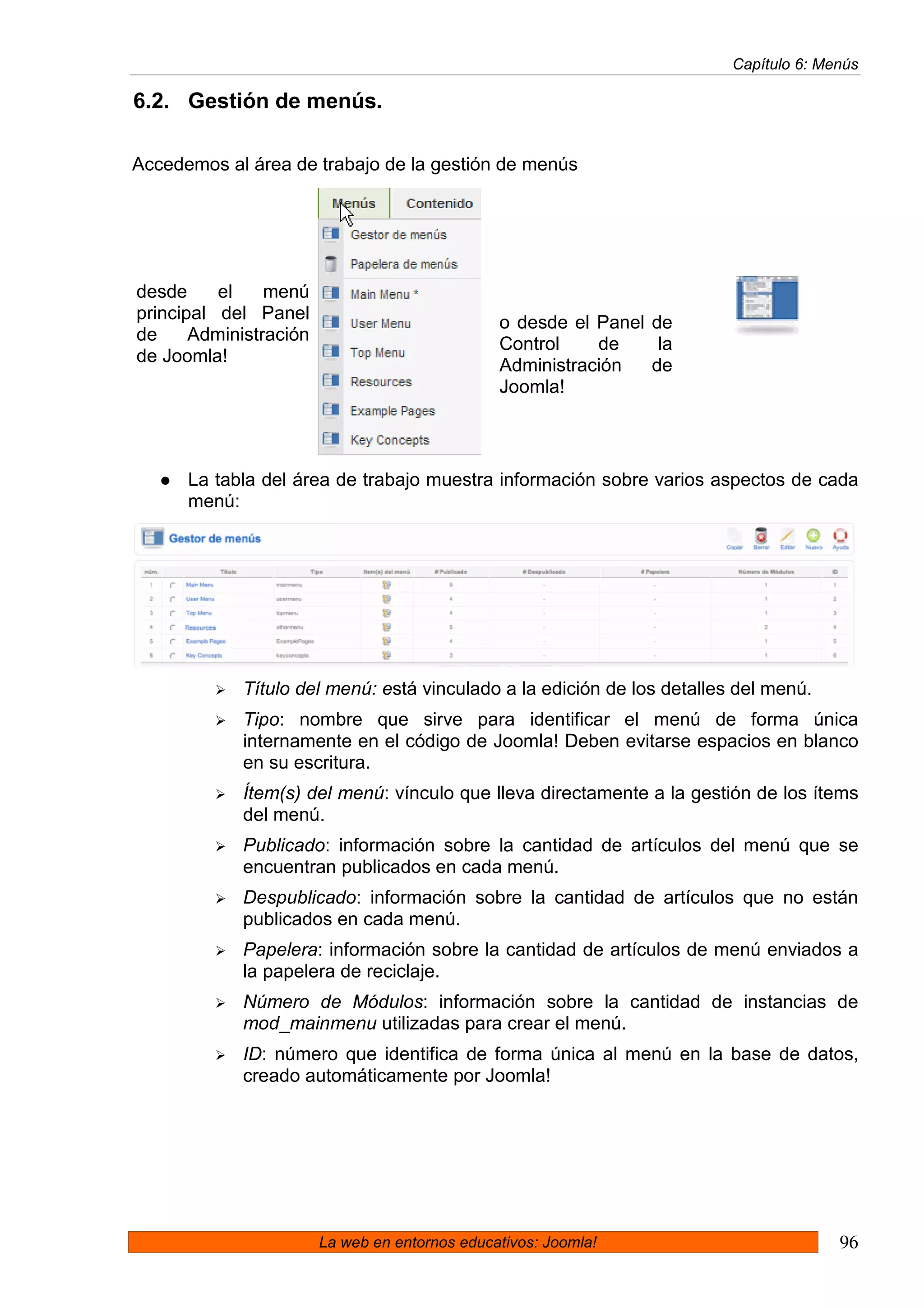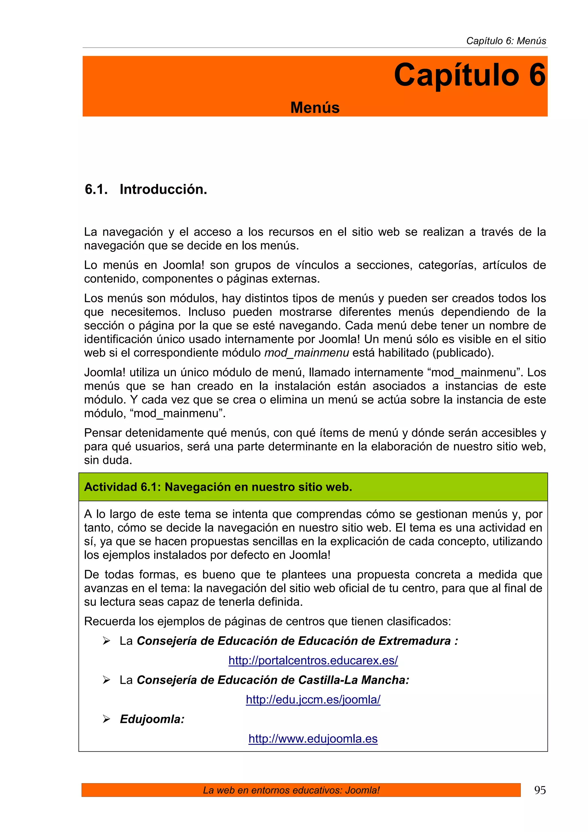 Este documento describe la gestión de menús en Joomla. Explica que los menús son grupos de enlaces que permiten la navegación por el sitio web y que cada menú debe tener un nombre único. También describe cómo crear y editar menús e ítems de menú, y los diferentes tipos y estados de publicación de los ítems de menú.