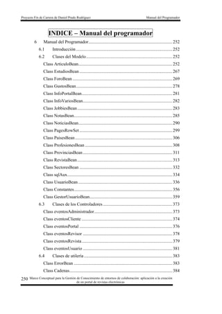 Este documento describe las clases utilizadas en el modelo de datos de una aplicación para gestionar un portal de revistas electrónicas desarrollada en Java. Se describen clases como ArticuloBean, RevistaBean y UsuarioBean que permiten gestionar y realizar consultas sobre artículos, revistas y usuarios respectivamente. También incluye clases de utilidad como Email o Fechas.