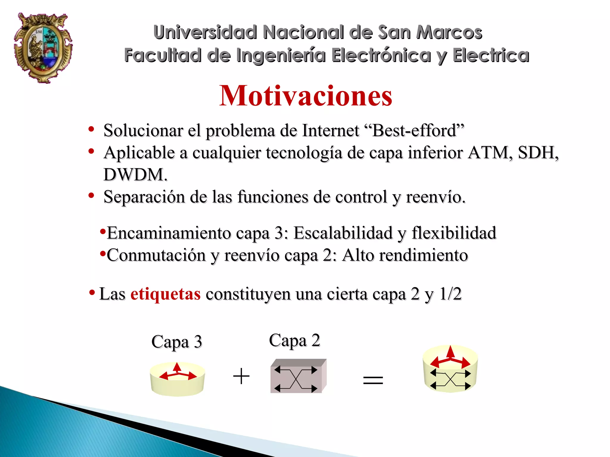 El documento describe las motivaciones y componentes del protocolo MPLS. MPLS busca combinar las ventajas de la conmutación orientada a conexión de ATM con los protocolos de enrutamiento de Internet. MPLS asigna etiquetas a los paquetes para permitir una conmutación rápida en los routers intermedios y soportar funciones como ingeniería de tráfico, policy routing y servicios de red virtual privada.