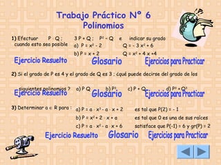 1. El documento trata sobre polinomios y sus operaciones. Define un polinomio y explica conceptos como grado, suma, multiplicación y división de polinomios.