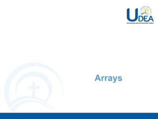 El documento presenta información sobre arrays en C++. Explica cómo declarar e inicializar arrays, indicando que los datos dentro de un array deben ser del mismo tipo. Proporciona ejemplos de cómo generar números aleatorios y llenar arrays con ellos, así como ejercicios propuestos para practicar el uso de arrays.