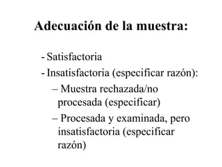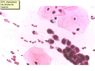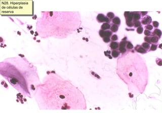 Este documento proporciona una guía para la citología ginecológica cervical y vaginal normal y hormonal. Describe las células que deben estar presentes en una muestra satisfactoria, incluidas las células escamosas, endocervicales y de la zona de transformación. También enumera varios tipos de células anormales como la hiperplasia de células de reserva y la metaplasia escamosa que se consideran dentro de los límites de la normalidad.