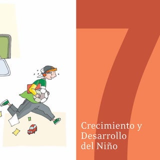 Este documento describe el crecimiento y desarrollo del niño. Explica que el crecimiento es un proceso continuo desde la concepción hasta la adolescencia que depende de factores genéticos, hormonales y nutricionales. Para valorar el crecimiento adecuado se miden el peso, la talla y el perímetro cefálico en controles periódicos y se comparan con curvas de crecimiento estandarizadas. También habla brevemente sobre el desarrollo psicomotor en las primeras etapas y proporciona